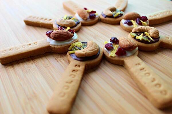 米粉クッキーにビターチョコレートとホワイトチョコレート、ドライフルーツをトッピング。チョコレートの甘さとドライフルーツのほのかな甘さが口の中に広がります。